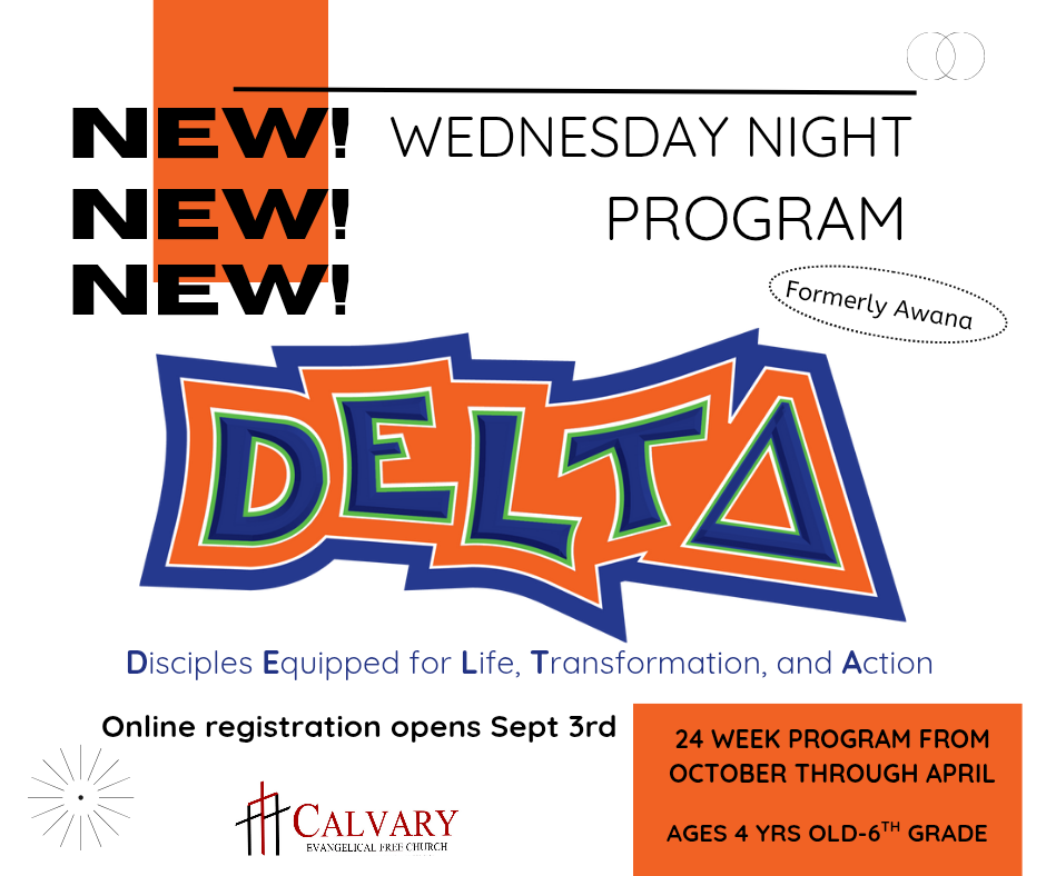Delta (formerly Awana) is a Wednesday night program that starts at 6:00 p.m. with a family supper each week, followed by Bible teaching and activities until 7:30 p.m.